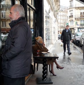 I couldn’t help myself but try to snap a picture of this beautifully dressed Parisian woman who was seated outside. She is wearing beautiful shoes, a beautiful coat, has a chick coiffure, but wait, is that a huge, fat cigar she is enjoying! It surely is, it surely is.