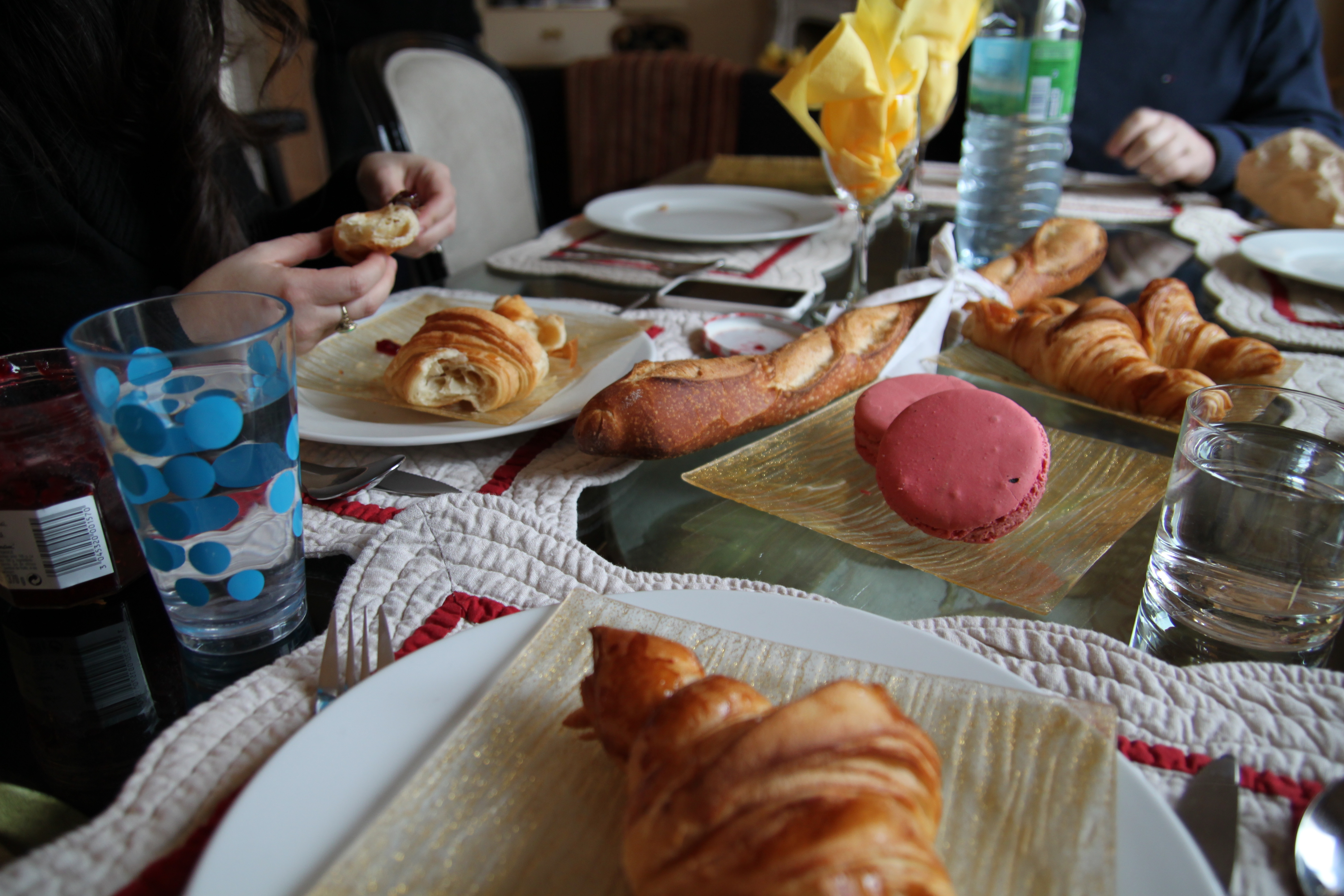 We are all ready for breakfast as my husband went to the boulangerie early this morning. We have her favorite fresh croissants and raspberry macaroons. We have steaming hot coffee on, some espresso for us, a nice pot of tea and we even have raspberry preserves and some fresh squeezed orange juice. Of course, we have the baguettes too!