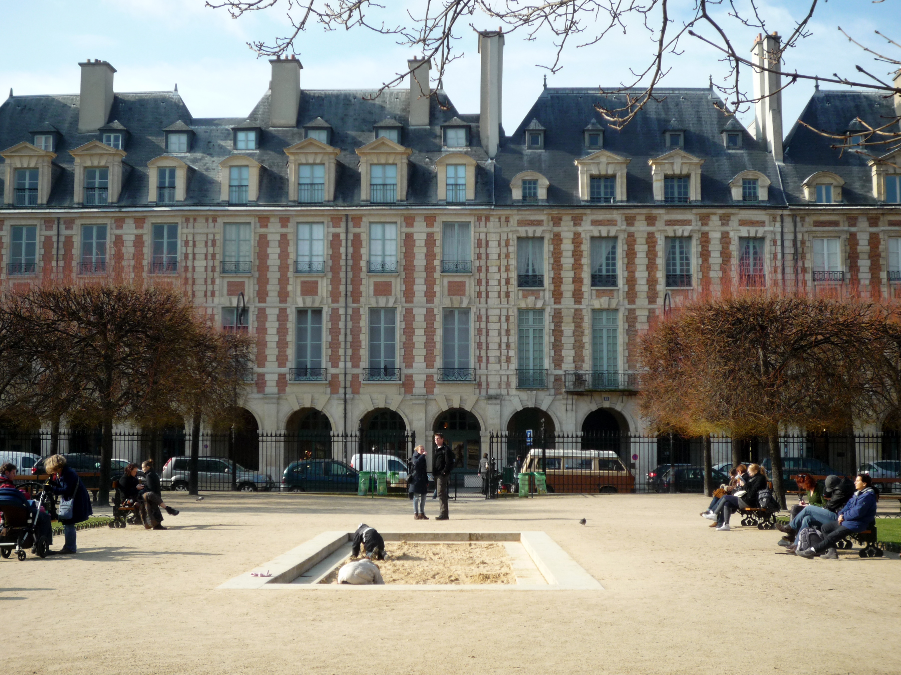 The Place des Vosges is the oldest planned square in Paris. It is located in the Marais district. It was built by Henry IV from 1605-1612, and was once a royal residence.